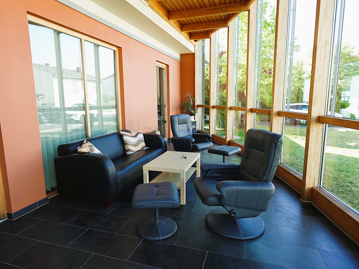Der lichtdurchflutete Wintergarten bietet Klient:innen einen angenehmen Rückzugsort vor oder nach ihrem Termin. Durch das natürliche Licht und die behagliche Gestaltung entsteht ein wohltuendes Umfeld, das Entspannung und innere Ausgeglichenheit fördert – ideale Bedingungen, um sich auf die Behandlung einzustimmen oder diese in Ruhe nachwirken zu lassen.