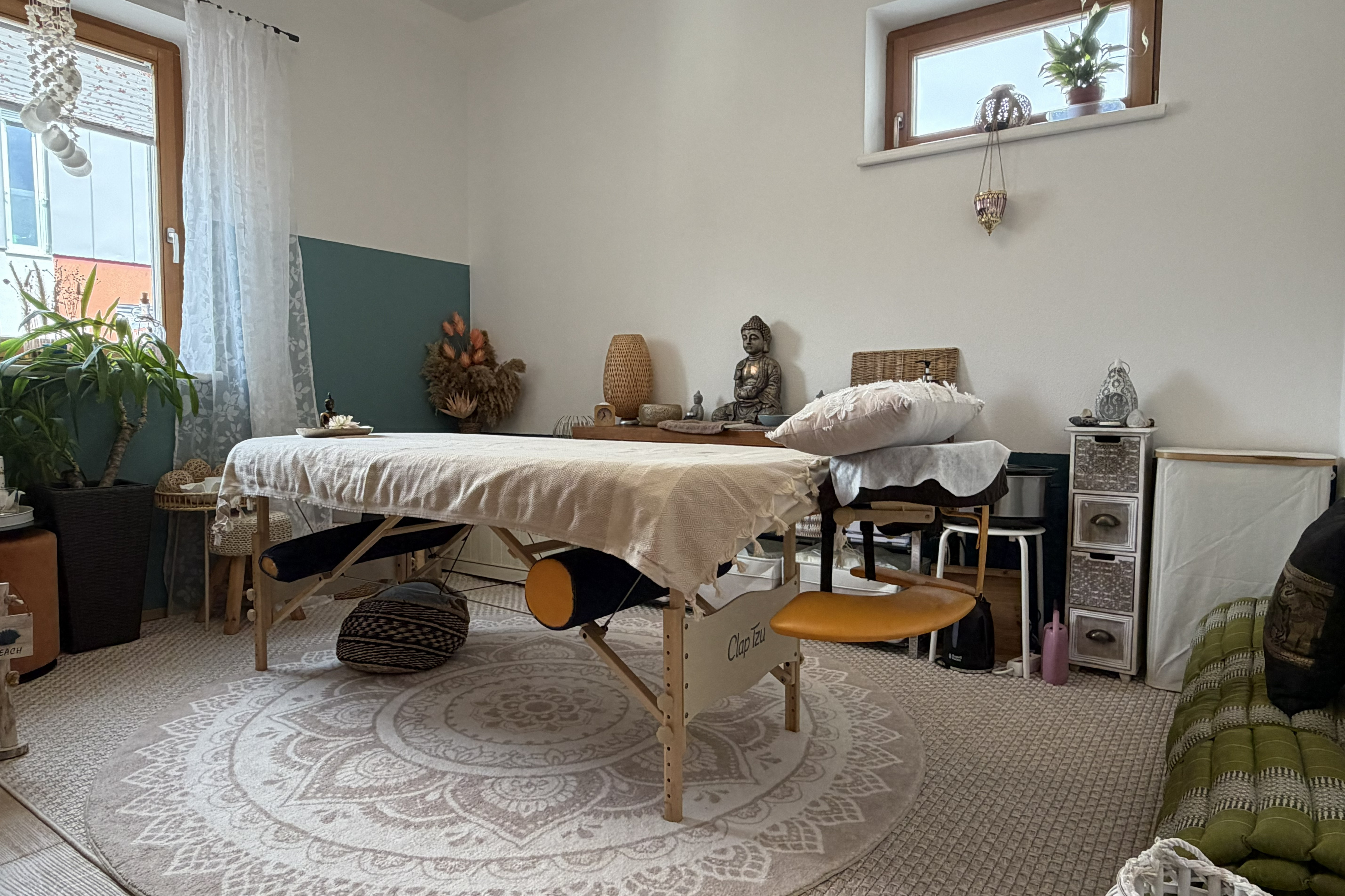 Der lichtdurchflutete Wintergarten bietet Klient:innen einen angenehmen Rückzugsort vor oder nach ihrem Termin. Durch das natürliche Licht und die behagliche Gestaltung entsteht ein wohltuendes Umfeld, das Entspannung und innere Ausgeglichenheit fördert – ideale Bedingungen, um sich auf die Behandlung einzustimmen oder diese in Ruhe nachwirken zu lassen.