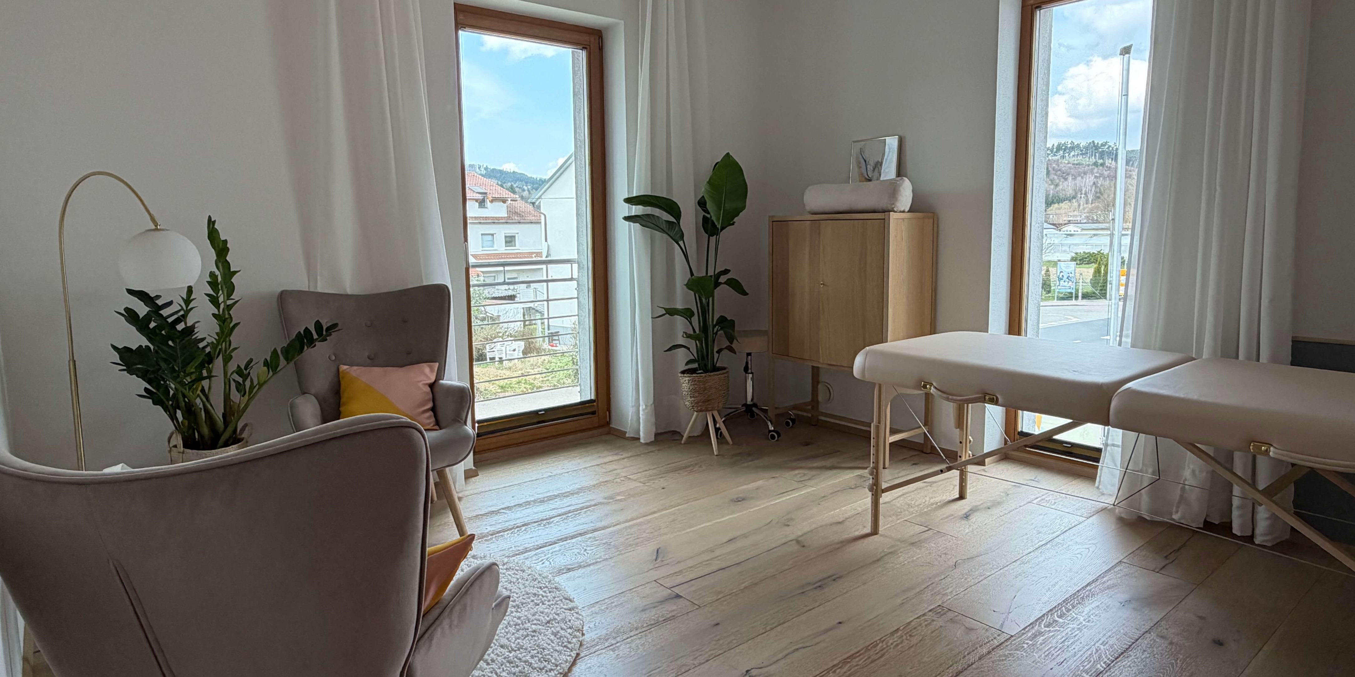 Der lichtdurchflutete Wintergarten bietet Klient:innen einen angenehmen Rückzugsort vor oder nach ihrem Termin. Durch das natürliche Licht und die behagliche Gestaltung entsteht ein wohltuendes Umfeld, das Entspannung und innere Ausgeglichenheit fördert – ideale Bedingungen, um sich auf die Behandlung einzustimmen oder diese in Ruhe nachwirken zu lassen.